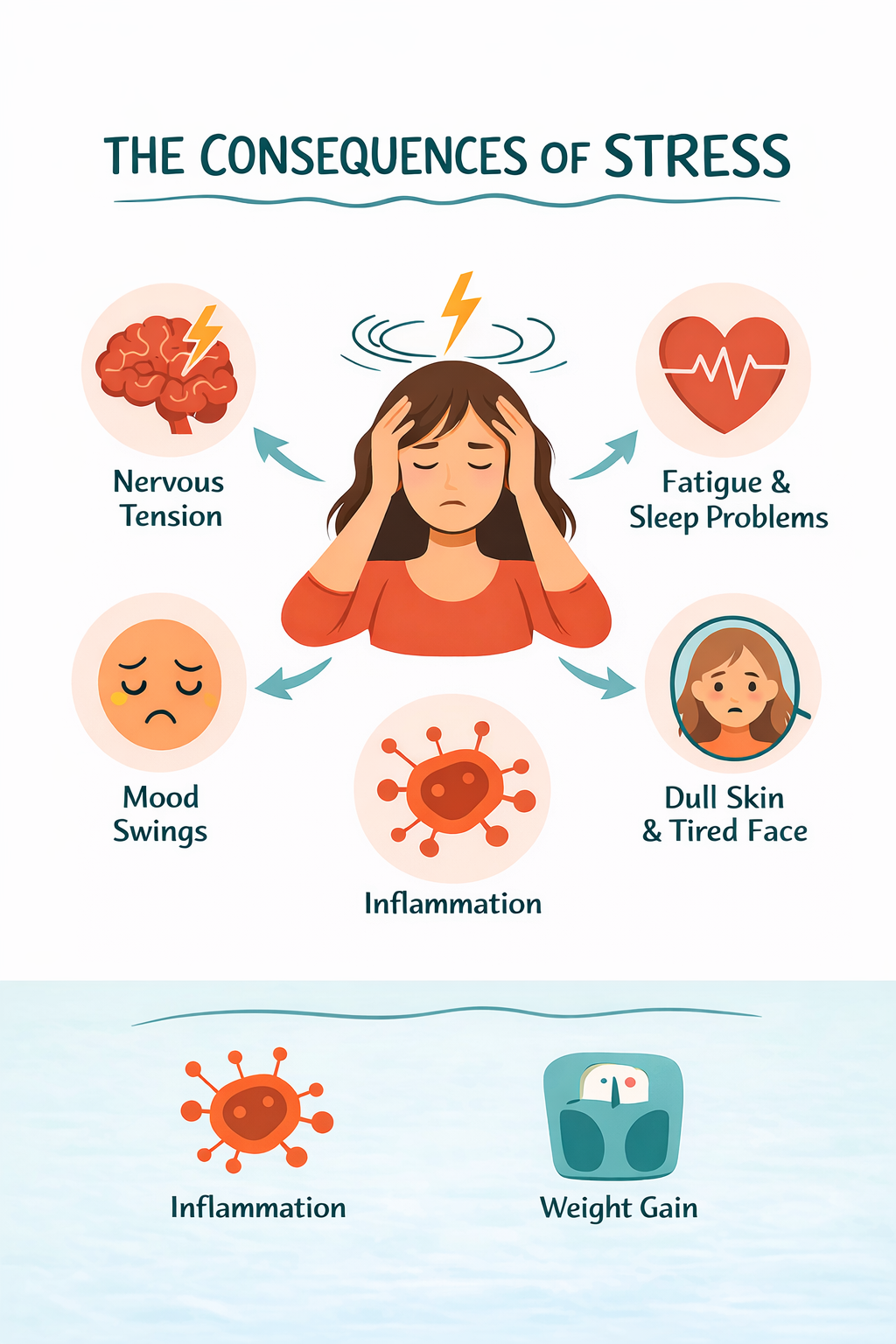 When stress becomes chronic, this prolonged hormonal stimulation leads to various physiological imbalances that may manifest as sleep disturbances, persistent fatigue, irritability, or reduced concentration. Over the long term, it can also promote inflammation, accelerate skin aging, dull the complexion, weaken the hair, and impair overall vitality.