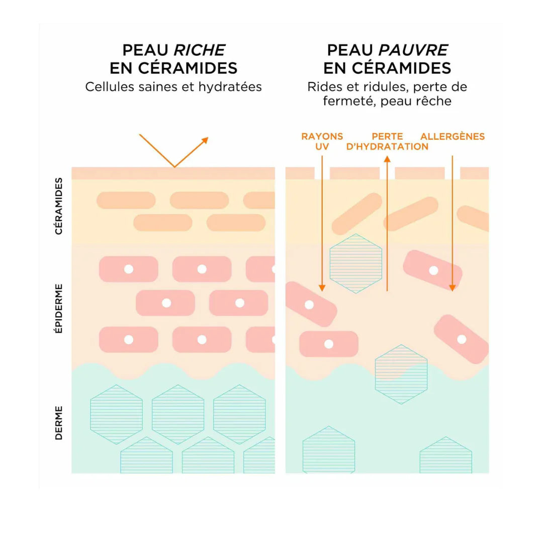As ceramidas estão naturalmente presentes na pele e formam uma barreira lipídica que ajuda a reter a humidade e a proteger contra as agressões externas . Com a idade, a sua quantidade diminui, resultando numa pele mais seca e propensa a rugas.