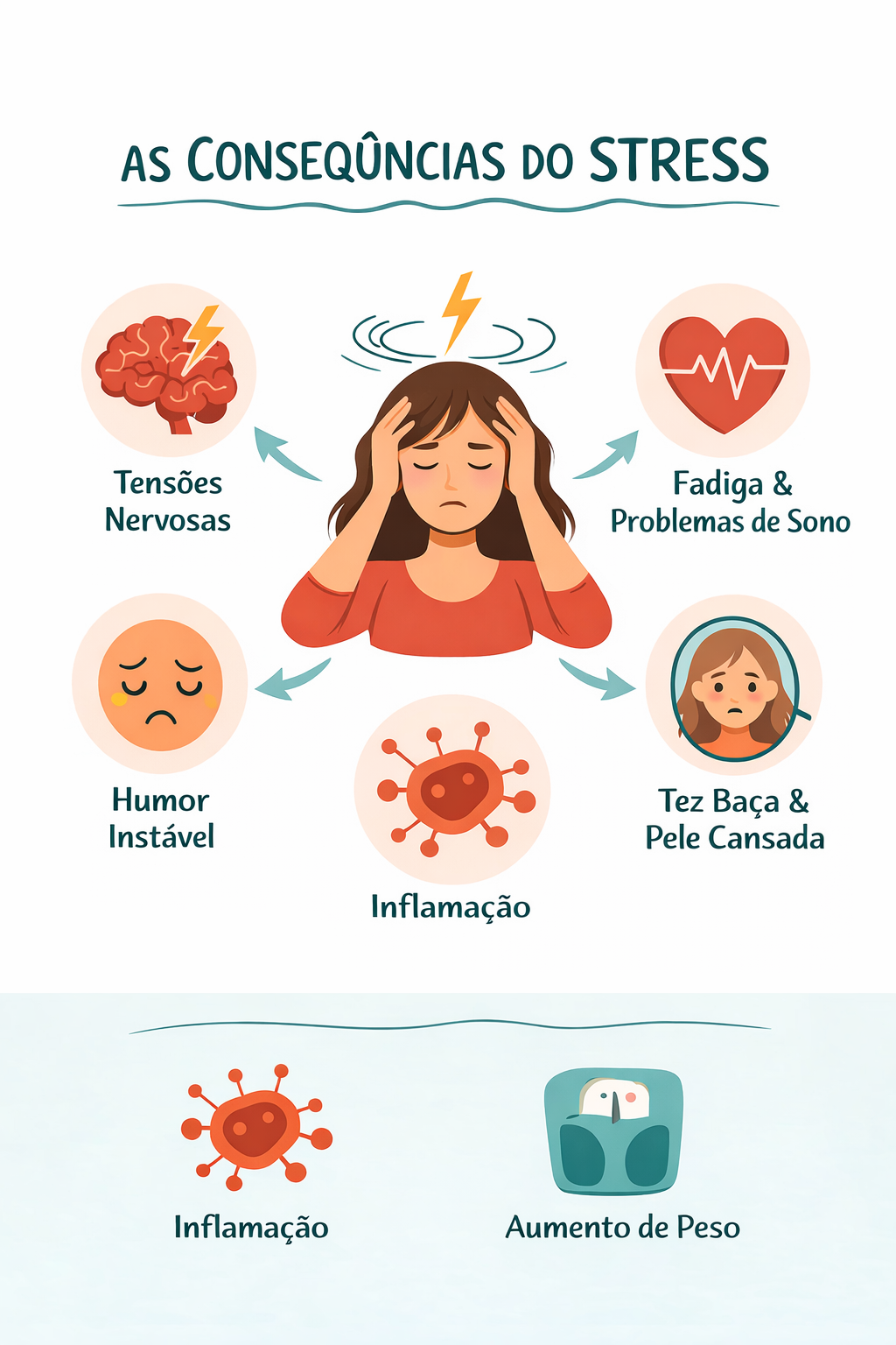 Quando o stress se torna crónico, esta estimulação hormonal prolongada pode provocar diferentes desequilíbrios fisiológicos, manifestando-se através de perturbações do sono, fadiga persistente, irritabilidade ou diminuição da concentração. A longo prazo, pode ainda favorecer a inflamação, acelerar o envelhecimento cutâneo, tornar o tom da pele mais baço, fragilizar o cabelo e comprometer a vitalidade global.